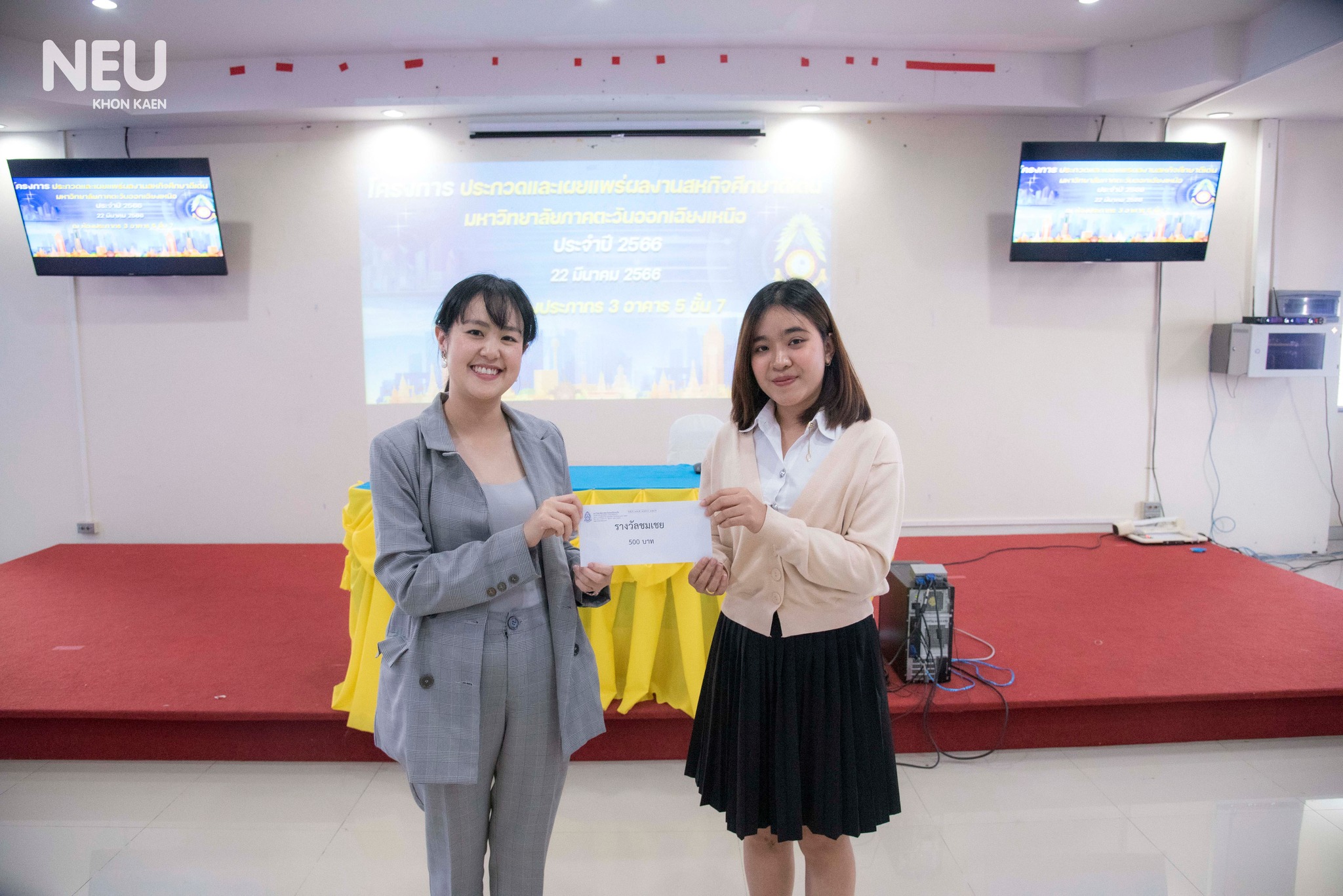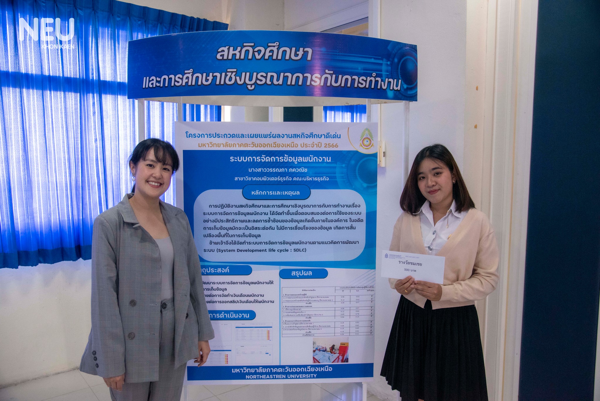 การประกวดและเผยแพร่ผลงานสหกิจศึกษาดีเด่น #มหาวิทยาลัยภาคตะวันออกเฉียงเหนือ ประจำปี 2566 วันที่ 22 มีนาคม 2566 สาขาวิชา #เทคโนโลยีธุรกิจดิจิทัล #คอมพิวเตอร์ธุรกิจ มีผลงานผ่านเข้ารอบจำนวน 2 ผลงาน ได้รับรางวัลชมเชย(รางวัลที่ 3) 1 ผลงาน คือ โครงงานระบบจัดการข้อมูลพนักงาน ห้างหุ้นส่วนจำกัด ขอนแก่นโลจิสติกส์ โดย นางสาววรรณภา ภควณิช